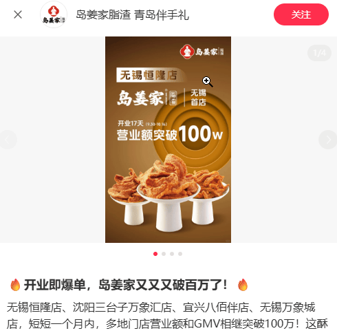 值得一提的是,拓店速度加快的同时,岛姜家的门店表现也十分亮眼,开一家火一家。据其小红书账号,其无锡恒隆店、沈阳三台子万象汇店等多家门店,开业仅一个月内营业额与GMV均突破100万元。
