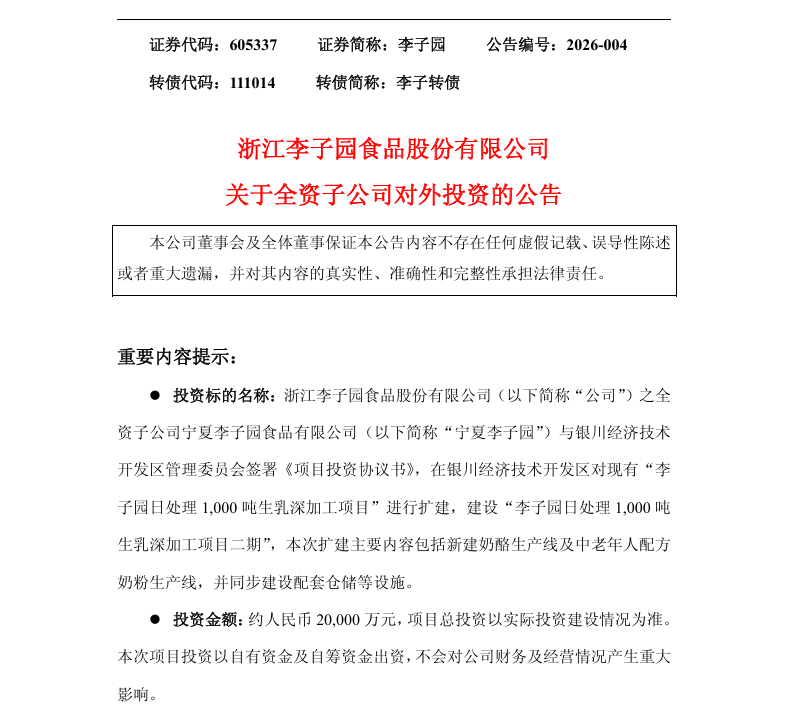3月4日,李子园发布公告称,全资子公司“宁夏李子园”与银川经济技术开发区管理委员会签署《项目投资协议书》,在银川经济技术开发区对现有“李子园日处理1000吨生乳深加工项目”进行扩建,建设“李子园日处理1000吨生乳深加工项目二期”。