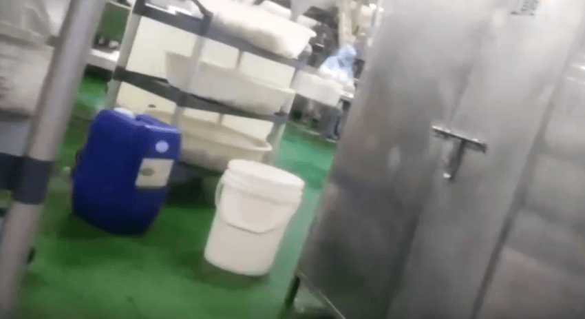 在生产车间里,记者观察到泡制区、修剪区、挑选区臭气弥漫。生产环境更是脏乱不堪:地面长期淤积着浑浊污水,各类塑料筐杂乱无章随意堆放,生产机械设备表面污渍厚重、油污遍布。