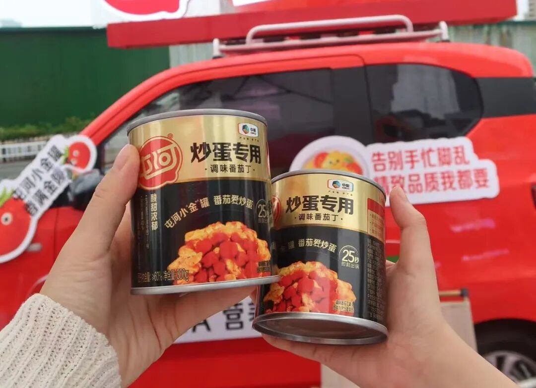 以番茄炒蛋为例,这类高频菜品对酸甜比例和出汁状态都有要求,但过去主要依赖经验判断。在这一难题下,“屯河小金罐”(炒蛋专用调味番茄丁)解决的就是在生产端先完成风味和处理状态的统一,让使用结果更稳定。