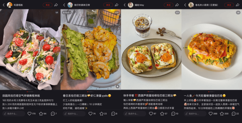 起初,大家只是热衷于分享自制的“漂亮”恰巴塔早餐,食材也多是烘焙中常用的原料:番茄、芝士、蔬菜、火腿培根,摆盘讲究。