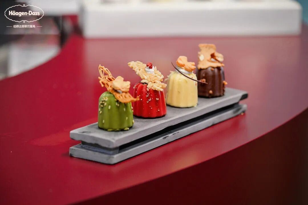 在Hotelex展会上,哈根达斯创意研发团队与世厨联国际裁判Louie Ye大师联合演绎了一系列冰淇淋菜品,展示了“甜品+”在不同场景下的无限可能: