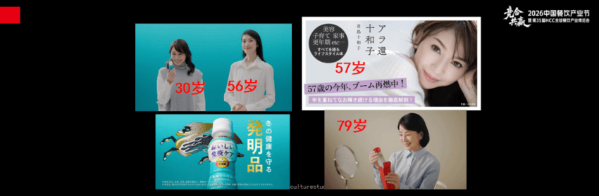 这些是日本的广告,一个人到了50多岁、60岁、70岁,还是呈现非常可爱、高雅的形象,很多人非常憧憬这样的景象。
