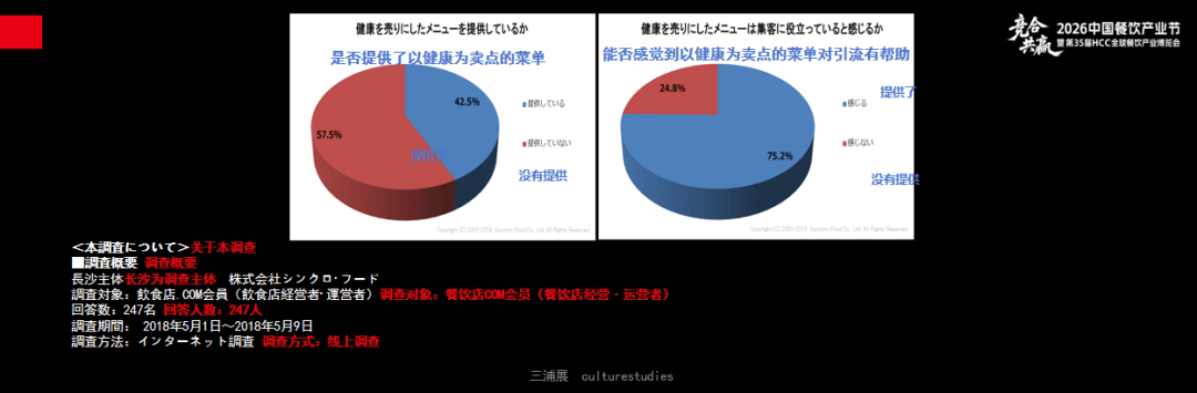 这是在日本所开展的一个调查,关于餐厅是否提供健康菜单的市场调查,有42%的受访餐饮店表示提供了健康菜单,并且有75%的店铺认为健康菜单能够有效提高客流量。