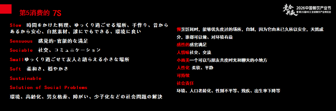 第五消费时代,我提出了“7S”关键词——慢、感性、人情味、小而美、人性化、可持续、社会责任。