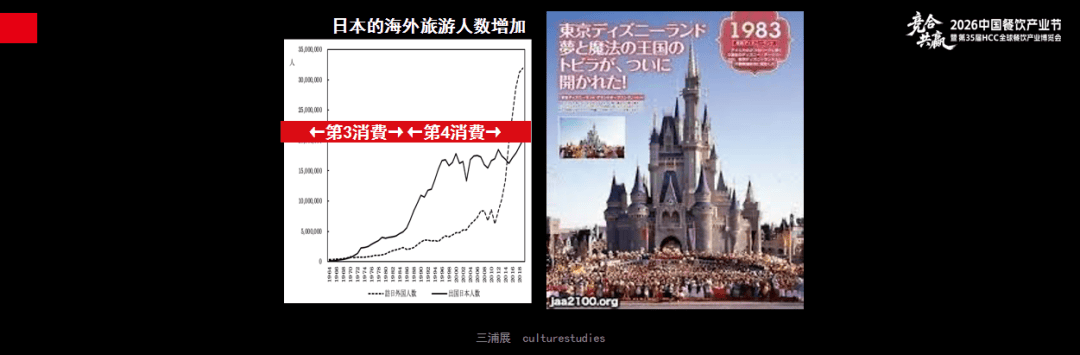 这张图左侧是日本人去海外旅行的人数,最初只有两三百万人出国旅游,1998年开始,每年出国旅行人数超过了1600万人。1983年,东京迪士尼乐园正式开业。在1970年代—90年代末,日本餐饮产业快速增长,市场规模达到了近30万亿日元。
