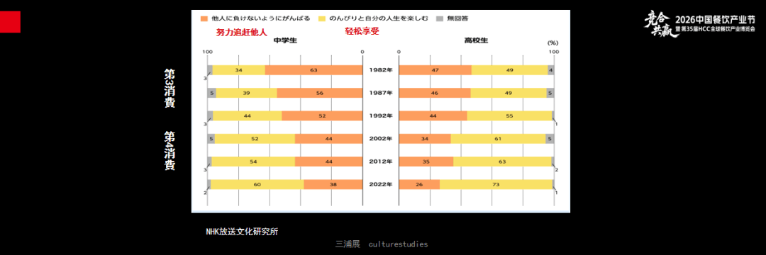 这是针对日本初中生和高中生的一项调查。左侧是初中生的数据,1982年63%的初中生表示要努力拼搏。但是到现在,60%的初中生会选择更加轻松的生活方式,价值观已经出现了天翻地覆的变化。右侧高中生的数据也呈现相同的变化。