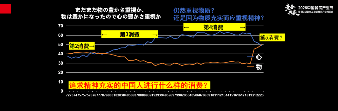 这是日本政府的一项调查,蓝色的线指的是,在物资非常充裕后开始追求精神丰富的民众数量,1970年只有30%的人追求精神丰富,第三消费时代这些人数越来越多。到了第四消费社会,有60%追求精神富足的人,但餐饮行业却在下滑。