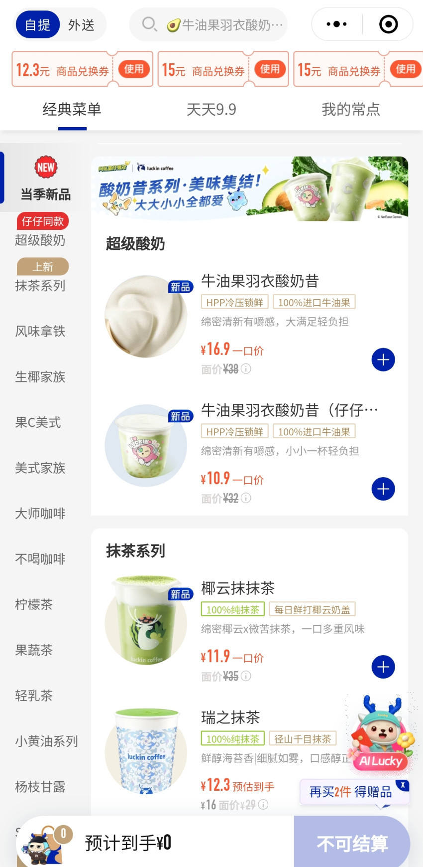 另一方面,瑞幸还加大了现制饮品产品上新力度。比如就在近日,瑞幸官宣上新了两款酸奶昔系列新品,分别是牛油果羽衣酸奶昔、瓦尔登蓝芒果酸奶昔。目前,瑞幸全国各大门店均已率先上线了牛油果羽衣酸奶昔,另一款产品暂未上线。