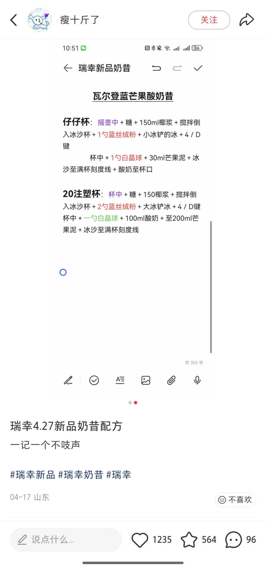 值得一提的是,酸奶昔系列的两款新品在食材的用法与用量上都十分考究,尤其是瓦尔登蓝芒果酸奶昔,从产品宣传图上看,制作这款饮品需要用到燕麦爆爆珠、有机酸奶、原味糖浆、北海道丝绒风味厚乳、羽衣甘蓝果蔬汁、冷冻牛油果泥等多款食材,且制作流程繁杂,一反瑞幸追求快节奏、标准化的惯性。