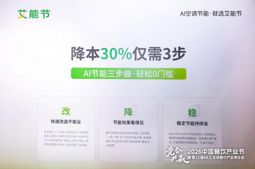 此次亮相第35届HCC餐饮产业博览会·2026春季展,上海艾能节智能科技有限公司,凭借前沿技术与创新方案获得现场来宾的广泛关注,现场充分展示了通过“AIoT硬件+AI算法+AI平台”三位一体方案,实现单店空调节能15%~30%,在确保门店舒适体验的同时,减轻员工管理负担、提升运营效率,助力企业构建绿色商业生态。创新的按效果付费模式,让企业零门槛、零风险拥抱AI节能,让每一度电都创造更高价值。